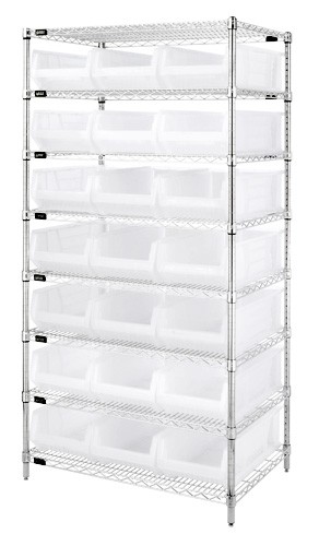 24" x 36" x 74", 8- Shelf Chrome Wire Shelving Unit with 21- QUS952 Clear Plastic Storage Bins