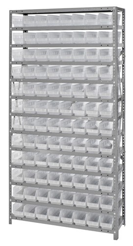 12" x 36" x 75", 13-Shelf Steel Shelving Unit with 96 QSB101 Clear Plastic Storage Bins