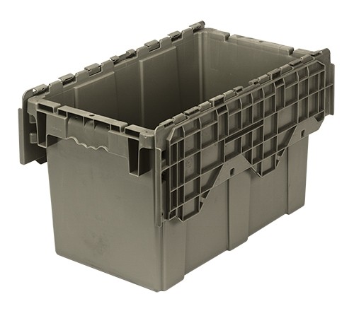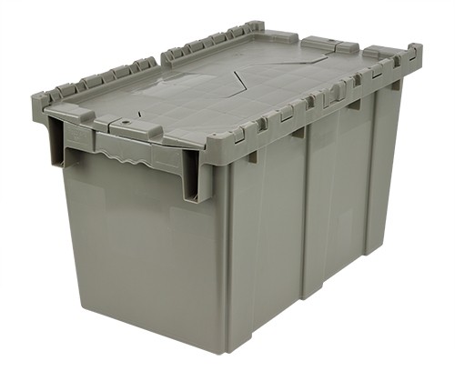 Perfect for distribution and off-premises supply centers! Strong, reliable and reusable totes are ideal for storage, distribution and order picking. Tops are permanently attached with steel hinges that interlock for stacking strength and security. Stack for maximized storage and nest when empty. Textured, non-slip bottom ensures smooth conveying. Ergonomically designed handles allow for easy lifting. Recessed lids ensure maximum load stability. Padlock eye provides security option allowing lids to be fastened and/or locked. Molded from high density, FDA approved polyethylene. Lids close securely to protect parts from dust or damage. Available in Gray.
