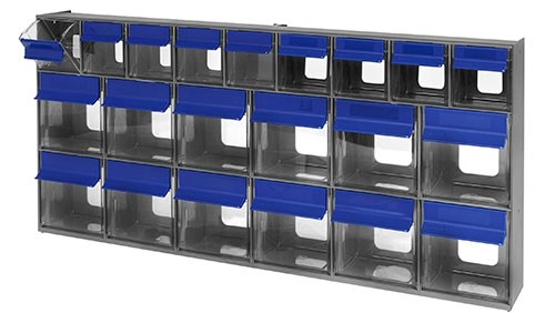 New one mold set of 21 compartments, make stacking and hanging super easy and fast. Space saving clear tip out tilt compartment bin units keep small and medium sized parts organized, sorted and easy to find. These clear, break resistant injection molded plastic containers tip open smoothly to a 45° angle and are completely removable for easy access and refilling. Molded handle with slots for labels provided. Bins are easily cleaned with soap and water. Polystyrene cabinet can be stacked or wall mounted. Exterior available Gray. Cups are clear with Blue handles.