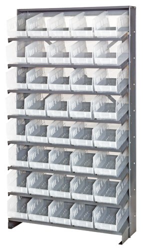 Single Sided Pick Rack with 40 QSB204CL Clear Plastic Storage and Display Bins