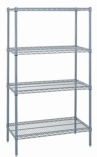 Heavy-duty gray epoxy Wire Shelves Shelving Starter Kits allow up to 800 lb. capacity per shelf and are ideal for retail store shelving and stockroom shelving. Starter Kits come complete with 4 posts and 4 wire shelves. Wire Shelves are all welded construction with additional wire trussing for high strength characteristics. Wire allows air to circulate and light to penetrate for increased product visibility and minimal dirt accumulation. Split conical sleeve adaptors secure shelf corner to post. Numbered grooved posts on 1 inch increments for quick assembly. No tools required for assembly. Additional shelves are available and sold separately. Includes 4- 54" Posts and 4- 12" x 72" Gray Epoxy Wire Shelves